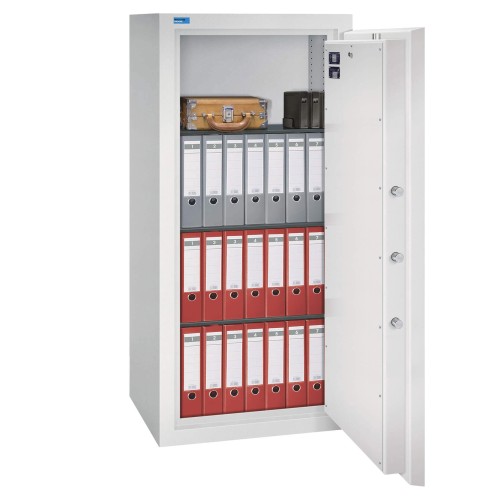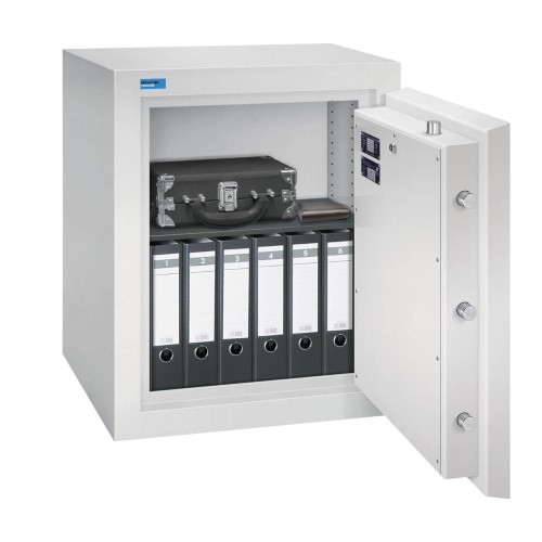 Der Widerstandsgrad II bieten einen höheren Schutz vor Zugriff durch Unbefugte. Die dreiwandige Tür sowie der doppelwandige Korpus sind mit einer Spezialfüllung versehen, welche Bohr- und Schneidbrennversuche sehr erschweren. Fünf massive Rundstahl-Bolzen verriegeln an drei Seiten die Tür und eine formgegossene Spezialpanzerung sichert zusätzlich zum säurebeständigen Doppelbart-Sicherheitsschloss den Zugangsmechanismus. Ein Aufhebeln der Tür verhindert eine Stahlhintergreiferschiene auch bei durchtrennten Scharnierbändern. Der leichte Brandschutz nach DIN 4102 wird durch eine umlaufende Feuerfalz gewährleistet. Das optionale Zubehör für die Inneneinrichtung ermöglicht eine ordentliche Unterbringung des Inhalts und sorgt so für optimale Raumausnutzung.